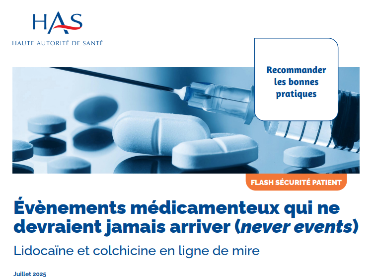La liste des « évènements qui ne devraient jamais arriver » (never events) médicamenteux a été actualisée en mai 2024 par l’Agence nationale de sécurité du médicament et des produits de santé (ANSM). Cette liste comporte, entre autres, les surdosages en lidocaïne par voie intraveineuse ainsi que les erreurs d’utilisation de la colchicine, des médicaments à marge thérapeutique étroite.